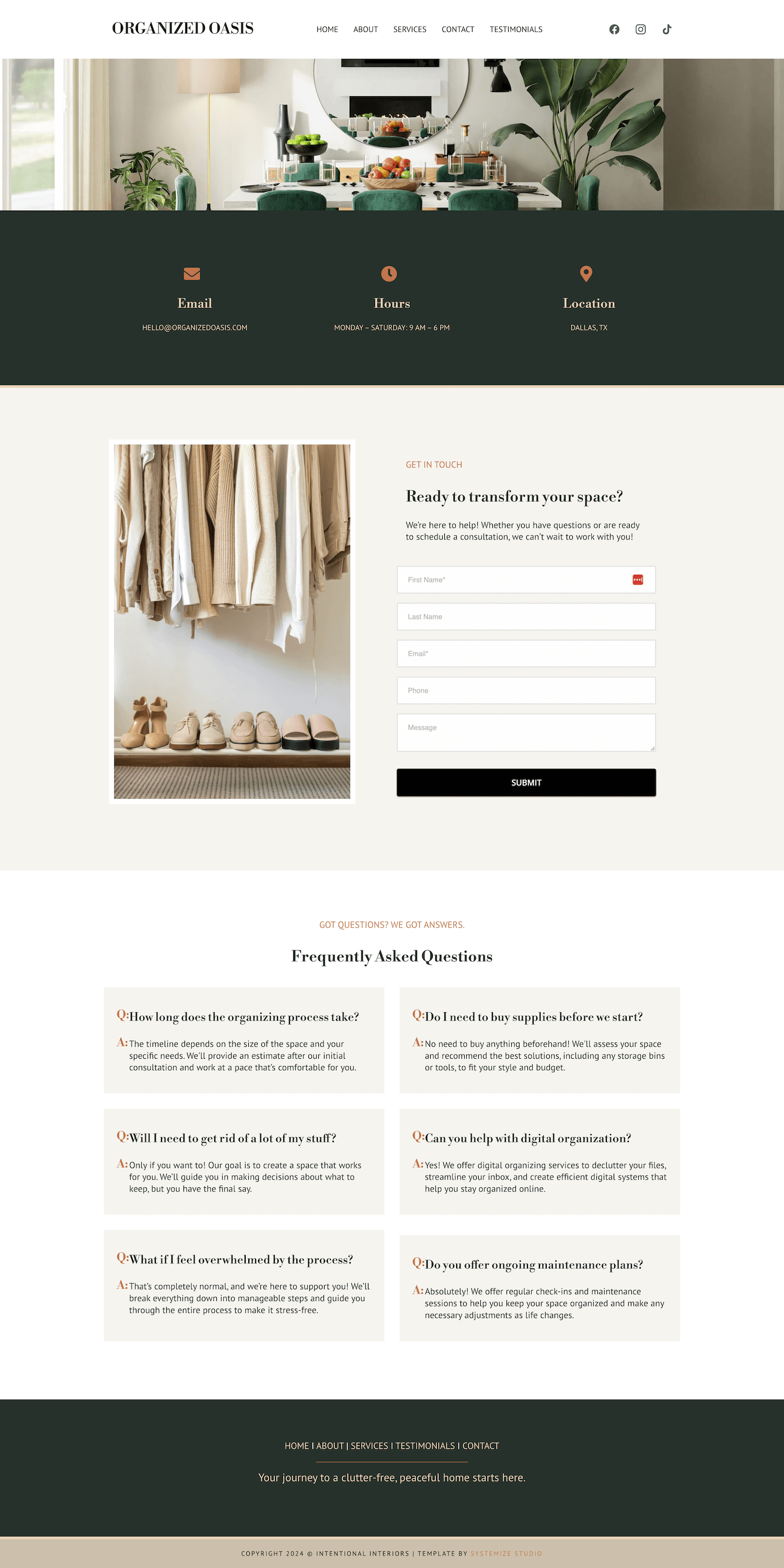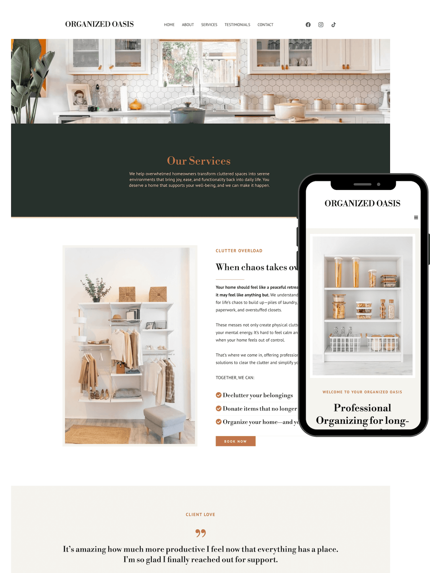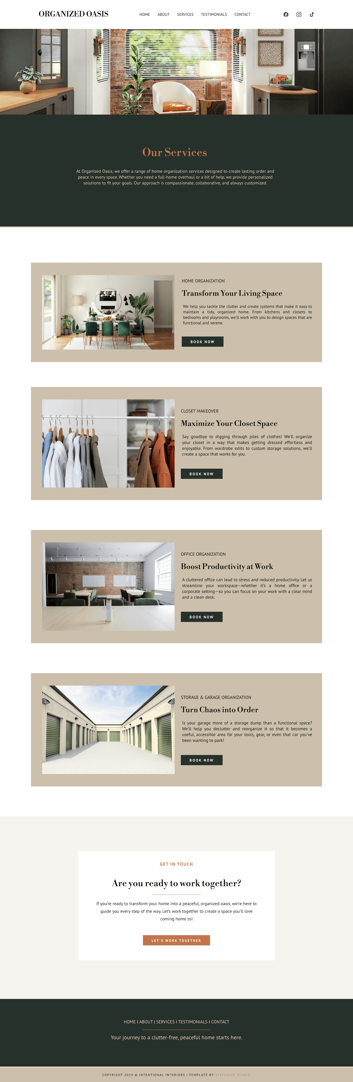 The Organized Oasis template offers a calming, serene design to represent the peace that comes with organization. This template is ideal for organizers who emphasize the transformative power of creating balanced, harmonious living spaces.